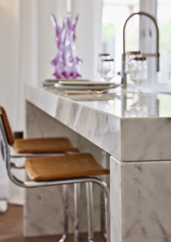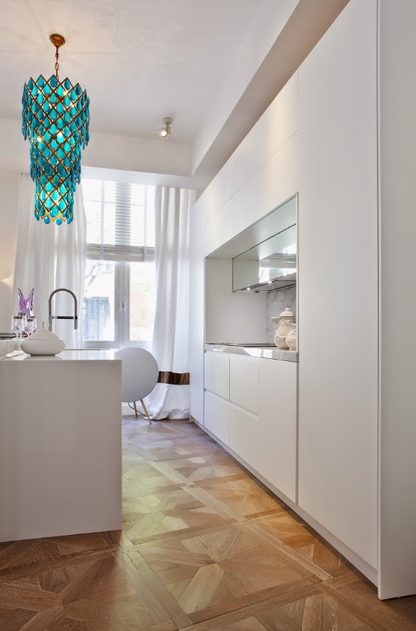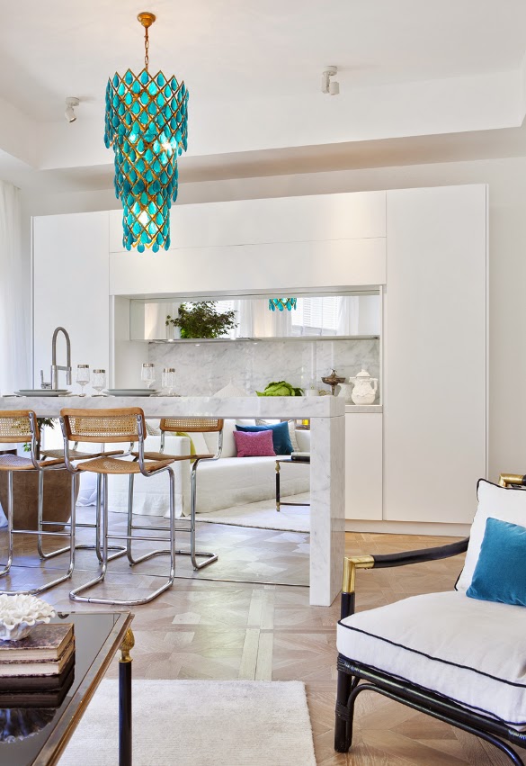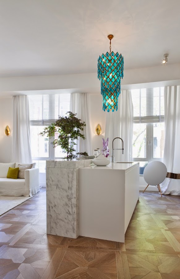La preciosa y espectacular lámpara de color turquesa, no dejó indiferente a nadie. Sin duda uno de los elementos deco más vistosos de la pasada edición. Aunque a mi me gustaría hacer especial mención a la cocina (ya sabes que son mi debilidad). De diseño muy sencillo, con puertas sin tirador o con tirador de uñero y de color blanco mate tanto la encimera como los muebles, como a mi me gustan. Se distingue una zona de barra, realizada en mármol con distinto grosor y enmarcando a su vez un espejo bajo, que crea sensación de profundidad y confiere aun mas luz y apertura a este precioso y elegante espacio. Coronando el precioso trabajo, la lámpara antes mencionada.