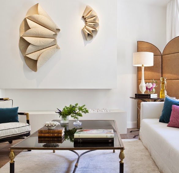 Completa la sala una zona living en colores neutros, donde destacan unas hojas dobladas y dispuestas en forma de abanico y un sinfín de sutiles detalles deco que conviven en perfecta armonía con el resto del mobiliario. Un espacio donde todos querríamos vivir.