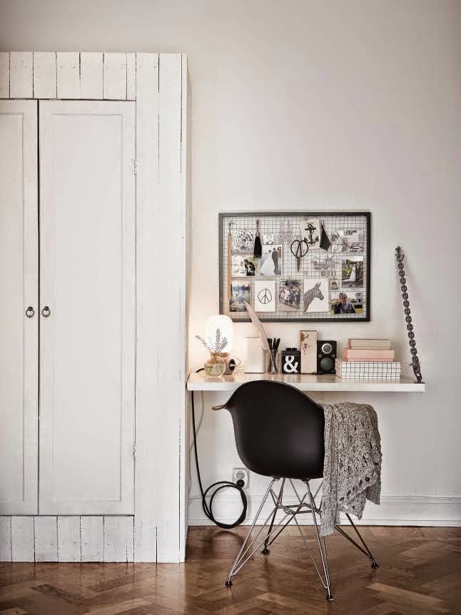Espacios pequeños en los que se improvisa un escritorio con un simple tablero, la importancia la tienen los complementos..y por supuesto la silla ¡Eames nunca falla!