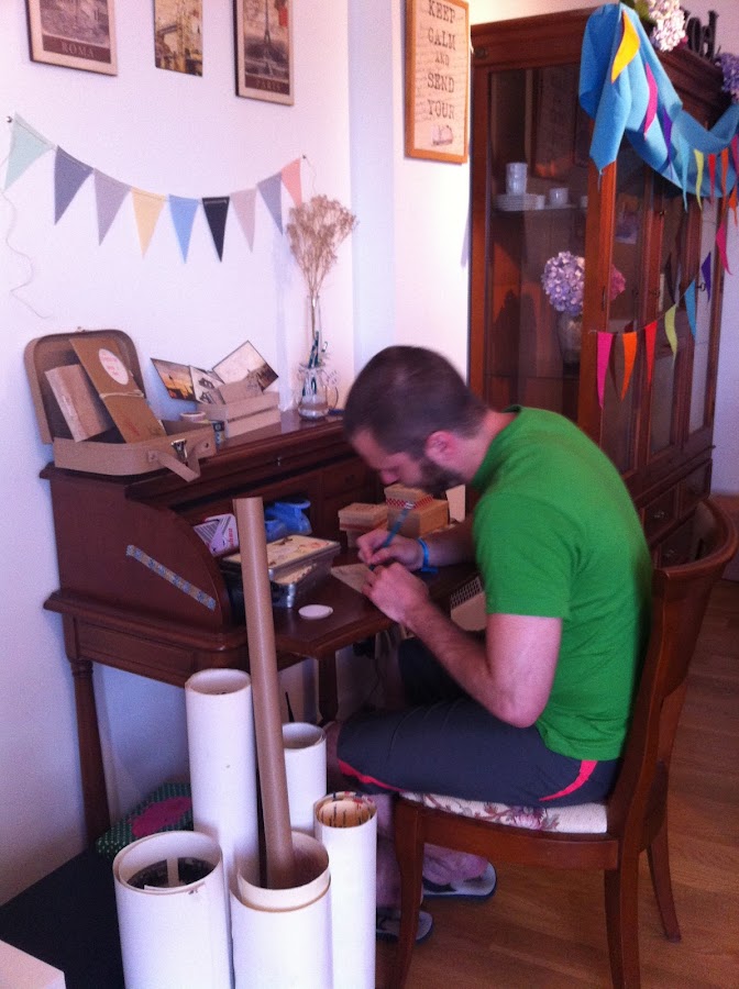 El papi todo concentrado escribiendo una postal para Fati y Xoel