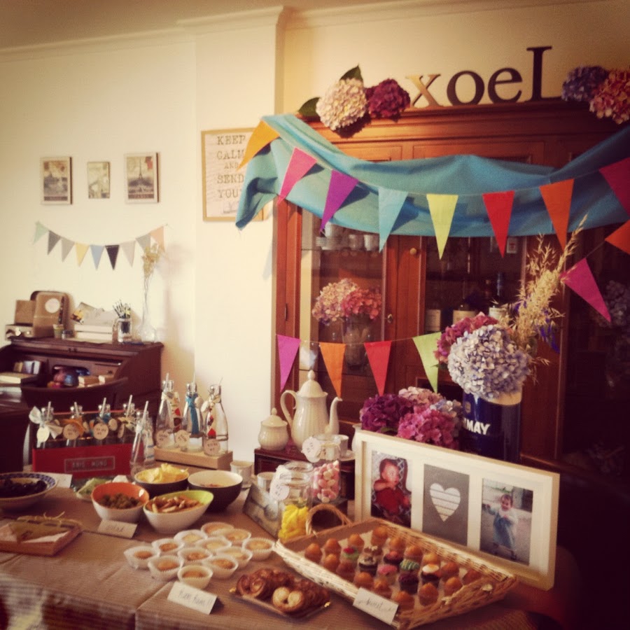 Hay mil y una historias más detrás de la organización de esta fiesta, pero lo que cuenta es que nos lo pasamos bomba, disfrutamos como enanas buscando telas que llevaran los colores de la habitación y la colcha de la cuna que ya tenían, pensando como hacer todo y haciendo a mano toda la decoración. Hasta levantándonos a las 8 de la mañana para ir a por hortensias a la playa y que la gente no nos mirara mal... Y después de todo eso llegó el día y se nos cayó alguna que otra lagrimilla cuando vimos la cara de Fati que no se esperaba nada de nada!