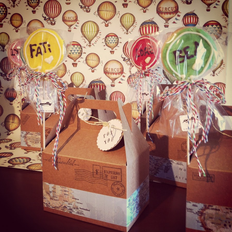 Regalitos para las invitadas_ Cajas de Selfpackaging, galleta personalizada con forma de globo de Praliné