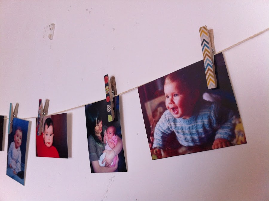 Pinzas decoradas con washi tape para guirnalda de fotos de bebe de amigos y familia