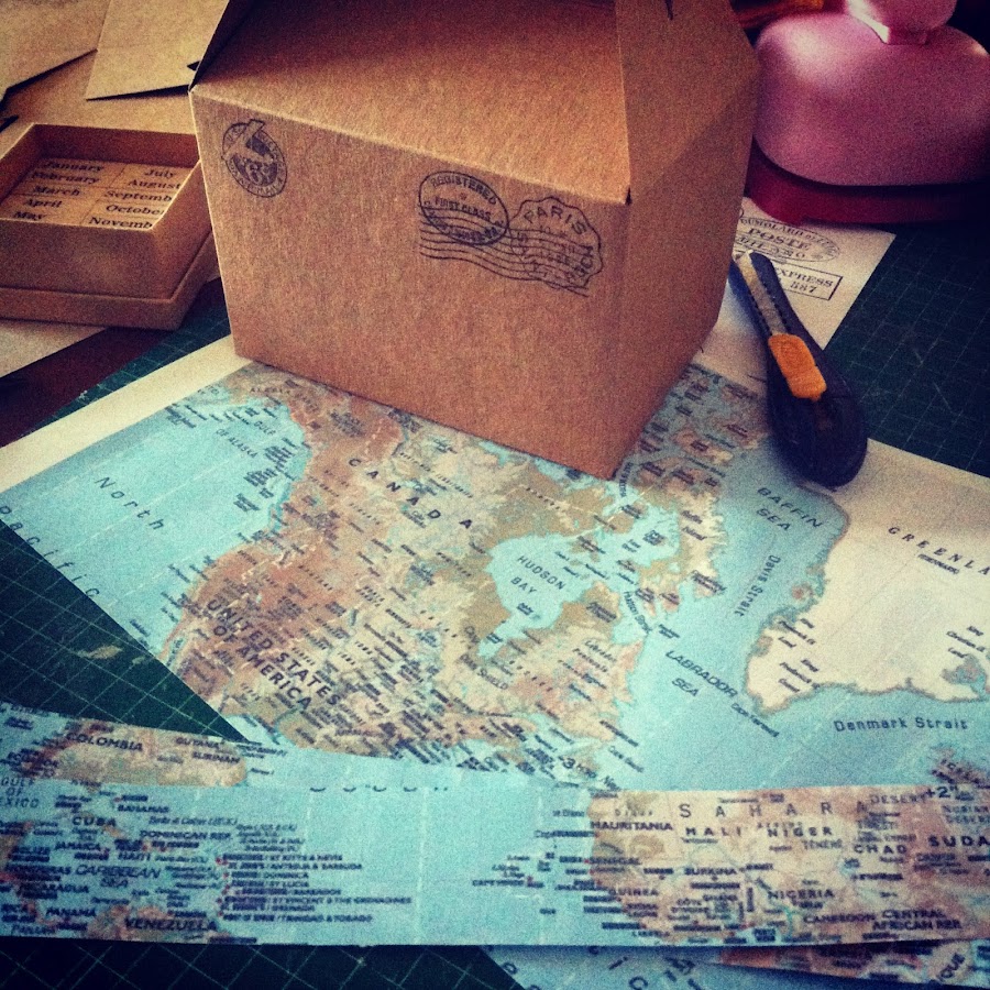 Segundo DIY_Cajitas de Selfpackaging decoradas con mapamundi y sellos de viaje
