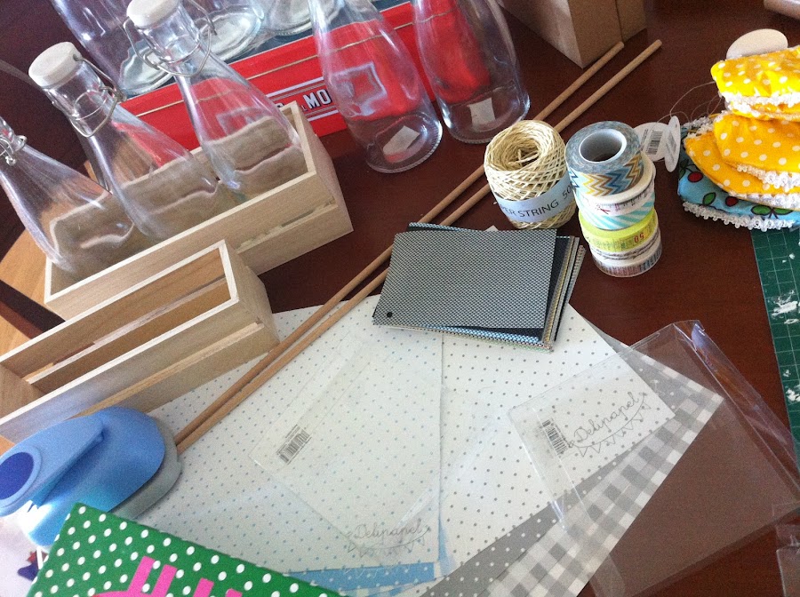 Siguiendo con la crónica del Baby Shower de Xoel, después de días y días planeando que hacer y que comprar me fui a Delipapel con mi lista, ilusa de mí...porque una vez allí, como siempre me pasa compré un montón de cosas más. Gracias a Maria que lo envió directamente a Coruña, todo el material sobrevivió al viaje, porque no se como habría llegado si hubiera tenido que meterlo en la maleta.