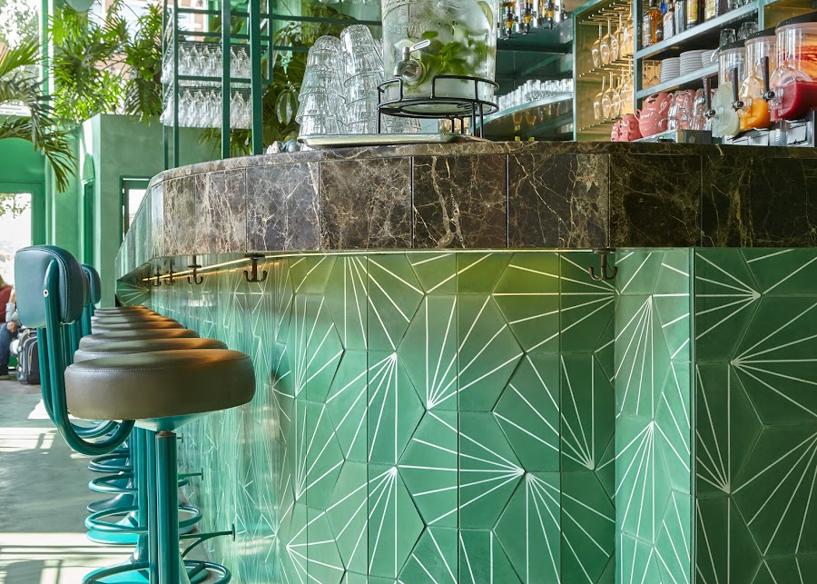 Detalle de la maravillosa barra, con bajo de azulejos hexagonales...