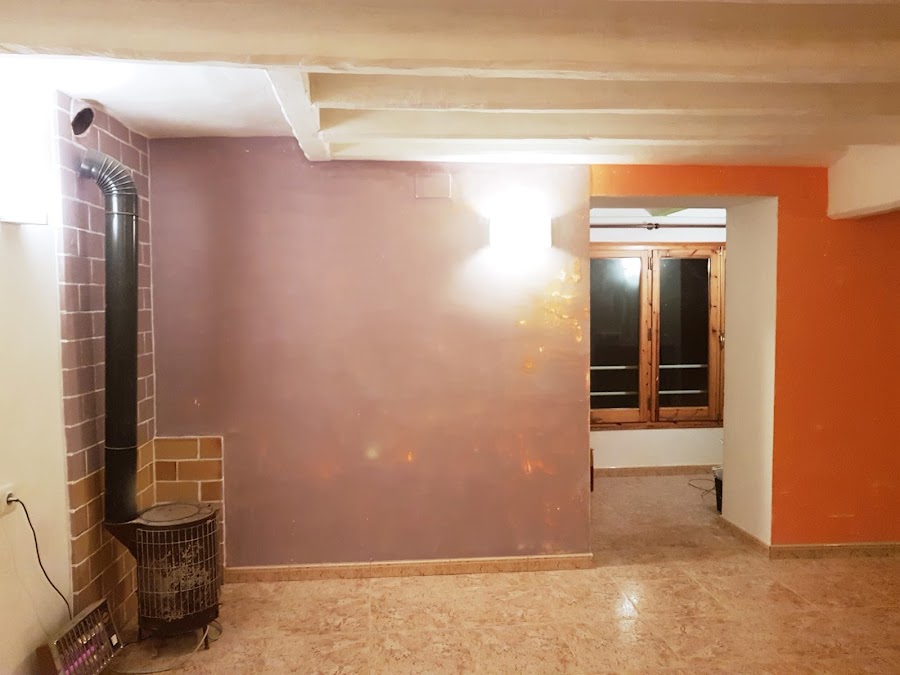 Otra de las partes que ya ha sufrido una transformación (pero que todavía no la vais a ver) es la entrada. La entrada tiene una pared naranja y una verde, y a decir verdad, no nos gustaba nada, así que, mano de pintura blanca y listo!. Faltará colocar algunas luces auxiliares porque el techo es muy bajito pero de momento, estamos pensando que poner.