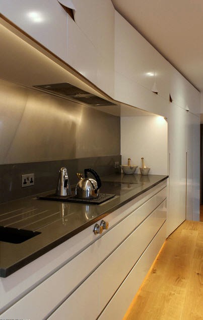 En un espacio complejo para planificar, demasiado estrecho para una isla convencional y muy amplio para dejarlo libre, el equipo de SplinterWorks ha optado por una escultura funcional a modo de isla de trabajo, como elemento central y que está ubicada entre dos sectores.