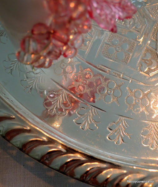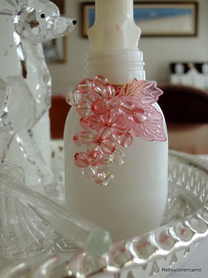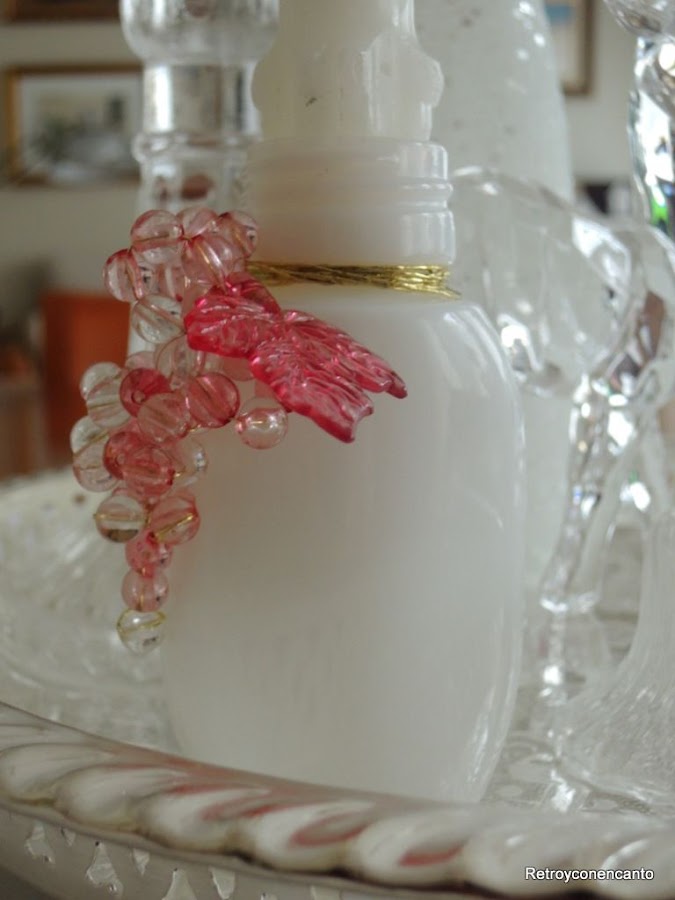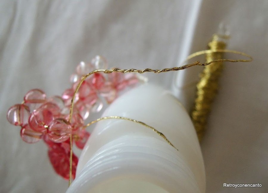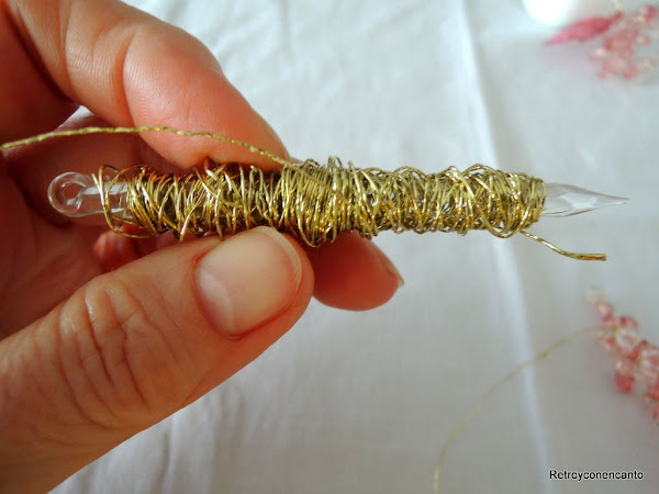 Hace tiempo teníamos una guirnalda que desmontamos por completo. El alambre que la sustentaba, fino y dorado, lo reciclamos enrollándolo en una lágrima de cristal.