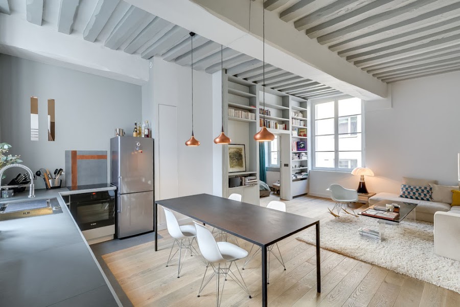 Un pequeño apartamento de altísimos techos, bigas vistas y todo bañado de blanco es el que descubrimos hoy en el blog.