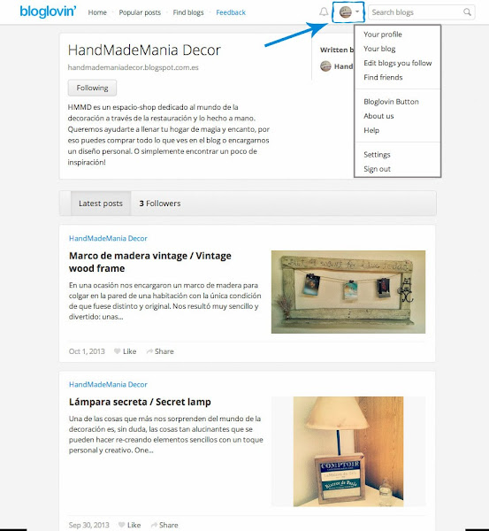 En la foto hemos marcado con flechas azules dónde puedes encontrar tooodos los blogs registrados en esta página (Find blogs) y las categorías en las que están clasificados, en este caso hemos seleccionado Home Decor. Cuando pinches ahí te aparecerá una lista y lo único que tendrás que hacer si quieres seguirlos es pinchar en el botón Follow. También puedes buscar por entradas populares (Popular post), donde se mostrarán entradas de todos los blogs, y cuando pases el ratón sobre cada imagen te dará también la oportunidad de seguirlo. Todo pensado para que sea muy fácil y manejable. { In the picture we have marked with blue arrows where you can find all the blogs registered on this page ("Find blogs"), and the categories in which they are classified, in this case we have selected "Home Decor". When clicking there you will see a list and all you have to do if you want to follow one is to click on the "Follow" button. You can also search by "Popular post", which will display all blog post, and when you mouse over each image, it will also give you the opportunity to follow it. All designed to be very easy and manageable }