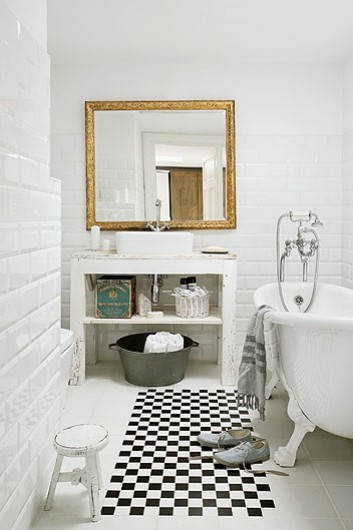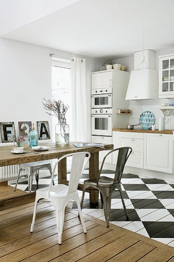 Los solados en listones de madera, decorados en la cocina con pintura en forma de damero, crea espacios llenos de personalidad y calidez, que se iluminan gracias a las aperturas de ventanas y el color blanco total que inunda techos y paredes. Se huye de una manera muy efectiva de la monotonía cromática en la que se podría caer. gracias a la incorporación de "destellos" de color vibrante que nos acercan al verano como los textiles, la madera lavada de muebles, los cuadrantes, las tolix o la nevera. Un punto de singularidad al esquema decorativo general.