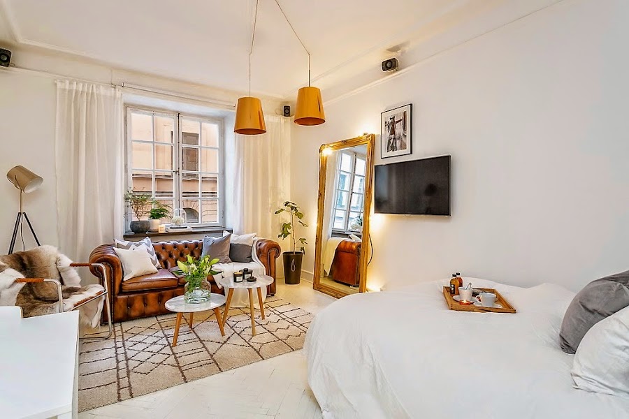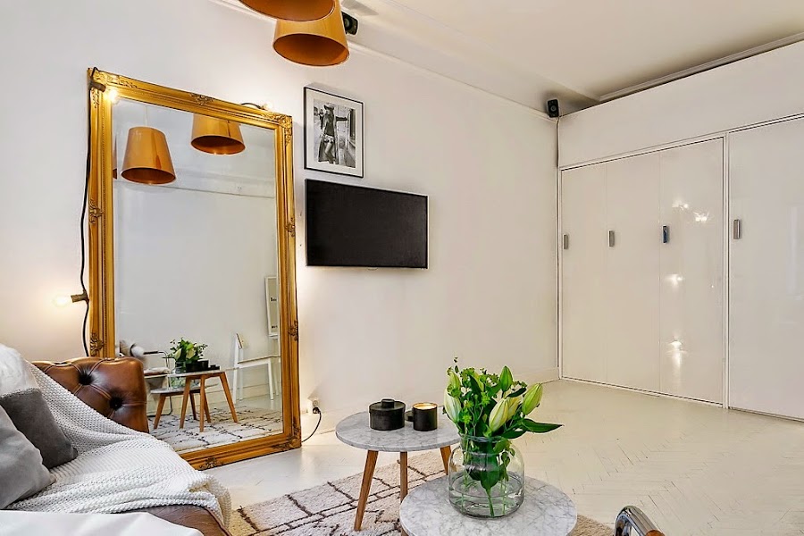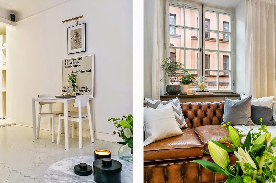 Un pequeño apartamento que refleja estilo en cada rincón de sus escasos 30 m² y cuyo protagonista y lo que me ha conquistado, el Chester de piel color tabaco envejecida del salón. Desde la misma entrada podemos contemplar el resto del apartamento casi al completo; el comedor con una pequeña mesa contra la pared y el salón que esconde la cama en el interior del armario, una solución muy práctica para crear un espacio polivalente en el momento adecuado, lo que permite aprovechar cada centímetro del estudio y disfrutar de la amplia sala todo el día.