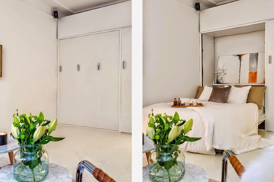 Un interior muy pequeño pero que gracias a la paleta y la iluminación con el mobiliario y demás, se crea una sensación de amplitud mayor. Todo un lujo de estudio diseñado al milímetro donde todo encaja y funciona.
