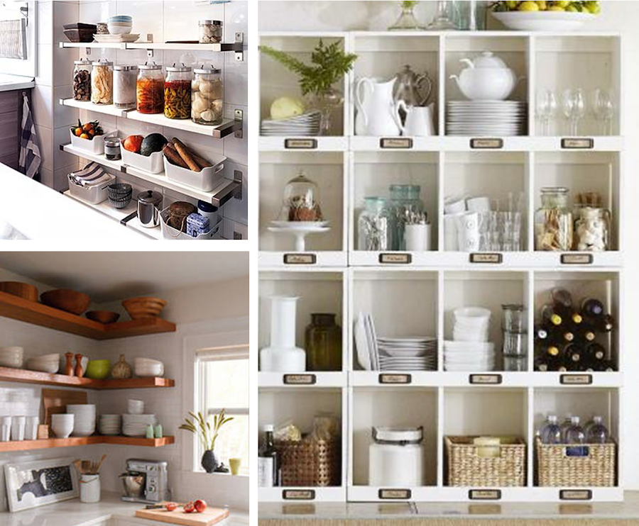 Organiza tu vajilla o cristalería en baldas o estanterías abiertas. Si bien es cierto que esto añade un plus de limpieza, también ganamos en comodidad y almacenaje.