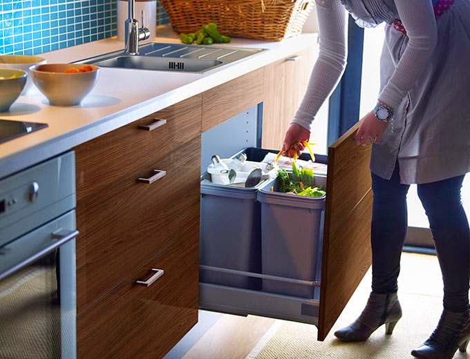 Cada día es mas importante reciclar, no se puede olvidar adaptar en nuestra cocina un muebles para los diferentes cubos de residuos. Lo ideal es instalar un extraíble bajo el fregadero.