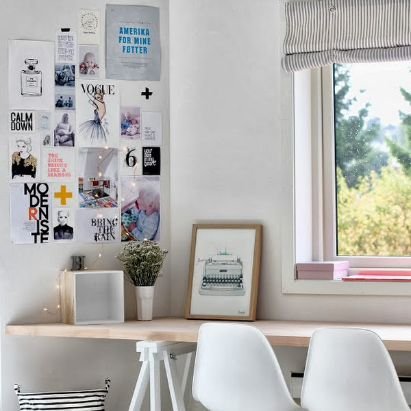 Pero fuera del mobiliario y fijándonos en los detalles hay que destacar el estupendo mural de pared, en las que paginas de revistas se complementan perfectamente con fotos personales formando un mural actual, lleno de tendencias y entendiendo así, que su protagonista no solo es adicta a la decoración sino también a la moda.