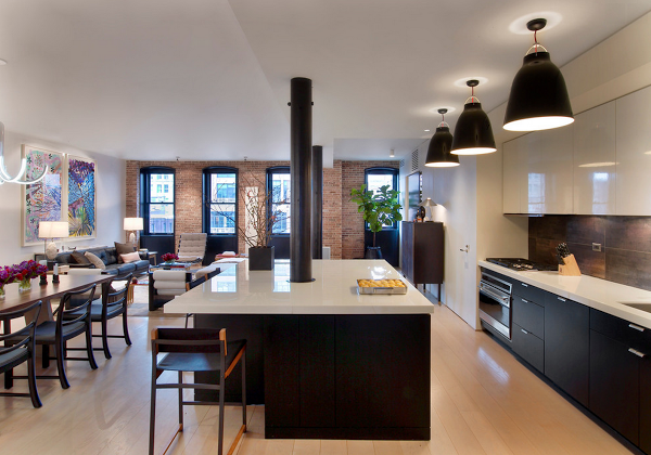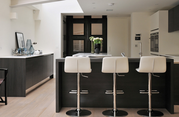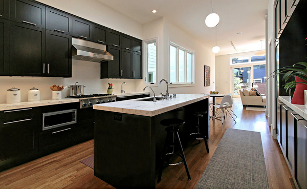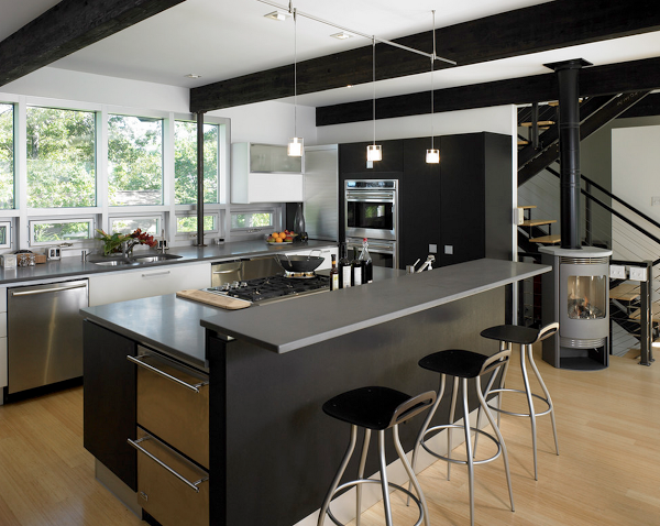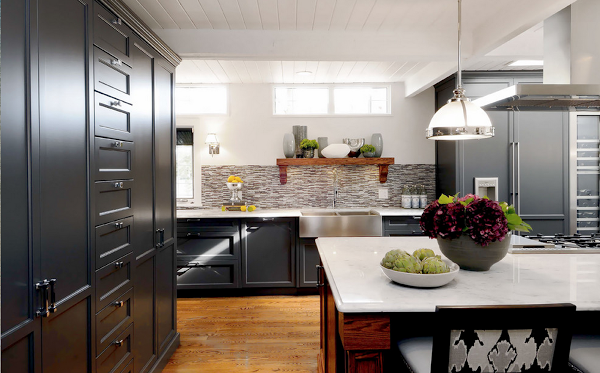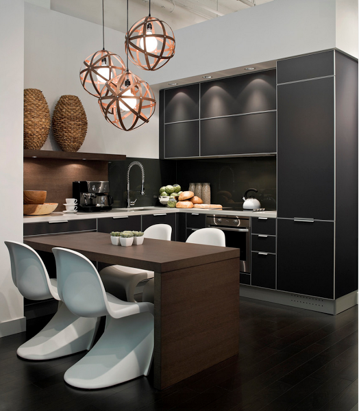 2) Cuando el color negro se envuelve de calidez rodeándolo del color miel de la madera (me encanta esta opción, es mi preferida):