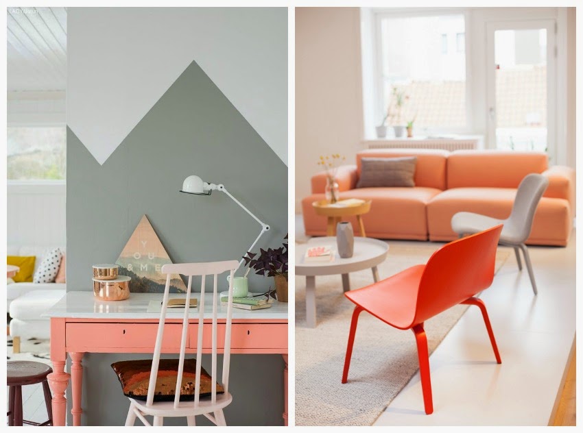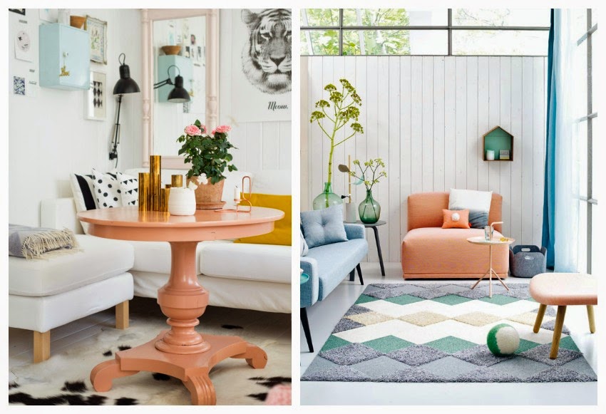 en la tapicería de una silla vintage o de un sofáOs dejo varios ejemplos que os servirán de inspiración, todos ellos en ambientes muy luminosos con un toque en melocotón, el resultado: ¡perfecto!.