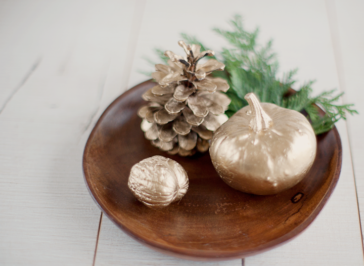 A veces nos complicamos la vida con centros de mesa para navidad rebuscados, caros o dificiles de realizar. Hoy os traigo uno inspirador con tan solo piñas, nueces y calabazas pintadas con purpurina, hojas de abeto y poco más.