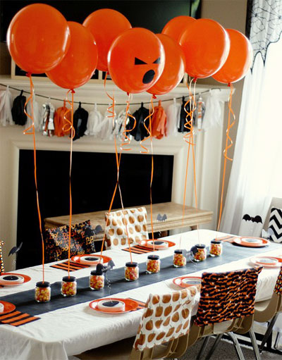 Me encanta la idea de los globos de helio. Los nombres de los comensales están colocados con murciélagos "voladores" . ¡Genial!