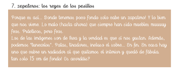 Ésto es algo muy, muy típico y que nos pasa a casi todos: nos falta espacio en casa para guardar. Nos falta también lugar para dejar el abrigo (cómodamente), los zapatos (más comodidad) y para los que vivimos en el norte, el (perenne) paraguas... En fin, que pasillos, zonas de entrada, descansillos y demás metros cuadrados que se pierden en las viviendas, podemos aprovecharlos para almacenar y no por eso, "saturar" la casa de mueblazos.