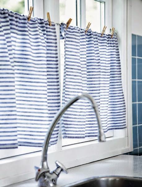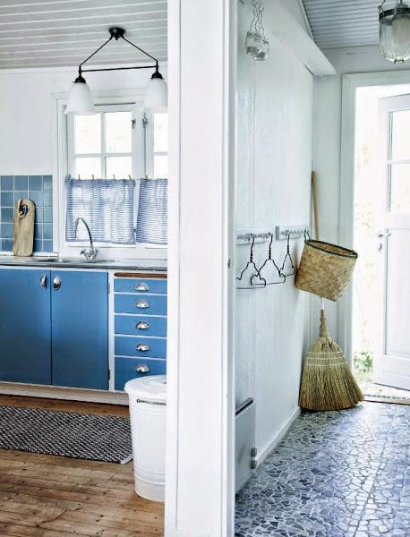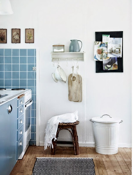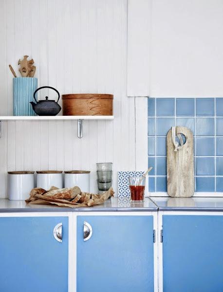 El AZUL CIELO, ¡todo un descubrimiento para andar entre cacerolas, azulejos y muebles! y esos visillos improvisados para ojear el exterior sin ser vistos... ¡encantadores a la par que sencillos! ¿no creéis?