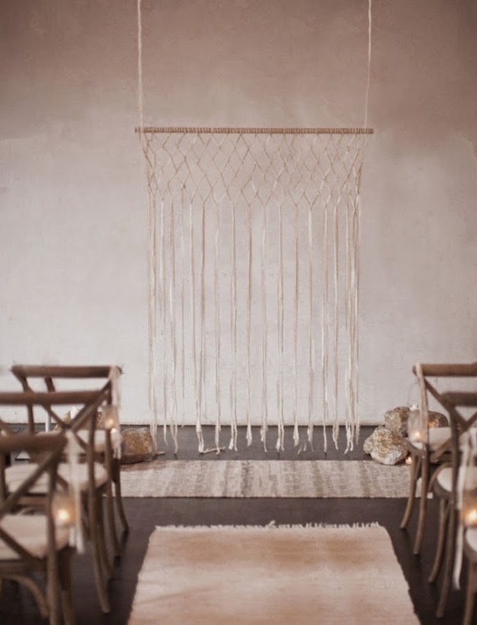 Macramé en alfombras, mantas,cojines, en maceteros colgantes (ayyyy.... si la abuela se entera de que nos pirramos por uno!), en la moda (collares, pulseras, accersorios que se rinden a los nudos!) y en casi todas partes. Macramé reinventado! La moda de anudarlo todo ha vuelto con fuerza, y la verdad es que adaptada a una celebración (en este caso una boda, pero quedarían también perfectos unos detalles de macramé para una comunión) nos encanta. Ambientación, DECO, alfombras y un entorno en base a colores claros, hacen de esta boda, una celebración especial.