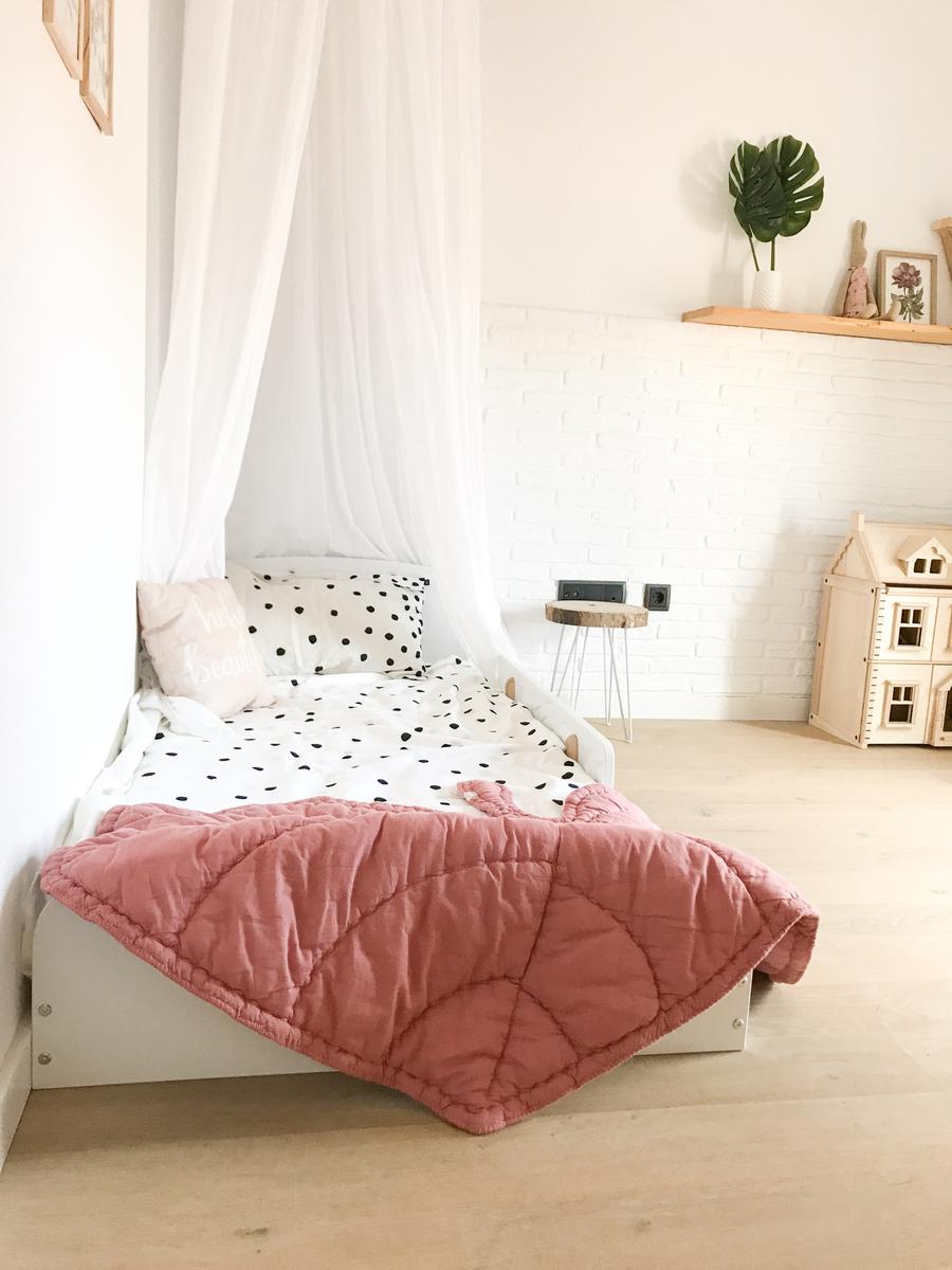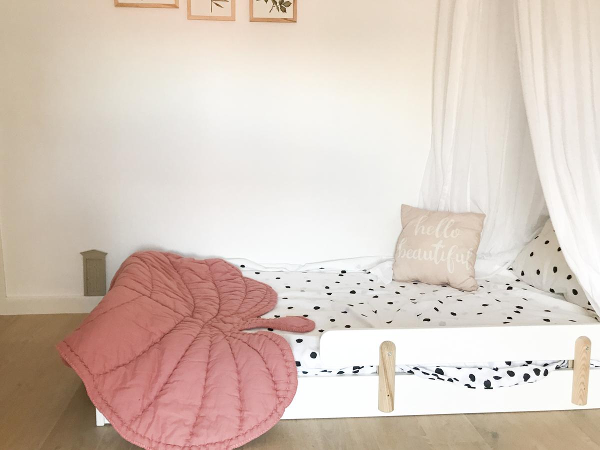 Para la cama, tenía claro que quería una de tipo Montessori (en otro post ya me dedicaré a contaros por qué son importantes este tipo de muebles y cómo podemos conseguir un dormitorio así). No encontraba ninguno específicamente para ello que me gustara, y los que sí eran demasiado pequeños, con lo cual estábamos en las mismas, no era algo definitivo. Así que finalmente me decanté por hackearlo nosotros mismos. ESTO ES MUY IMPORTANTE, ya que esta cama de Flexa no está pensada para ser usada de este modo. Nosotros lo que hicimos fue sacarle las patas y dejarla en el suelo. Ha sido una decisión nuestra, y por supuesto desde la marca no dijeron que no nos lo aconsejaban. Quiero que quede muy claro este punto.