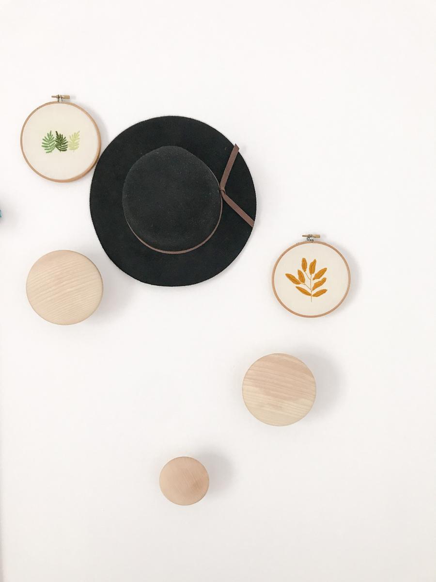Y como toque final, añadimos unos colgadores preciosos de Domestico Shop en diferentes tañamos a una altura que llegara sin problemas Valentina. Lo combinamos con unos bastidores con motivos florales, muy boho, que me bordó mi abuela.