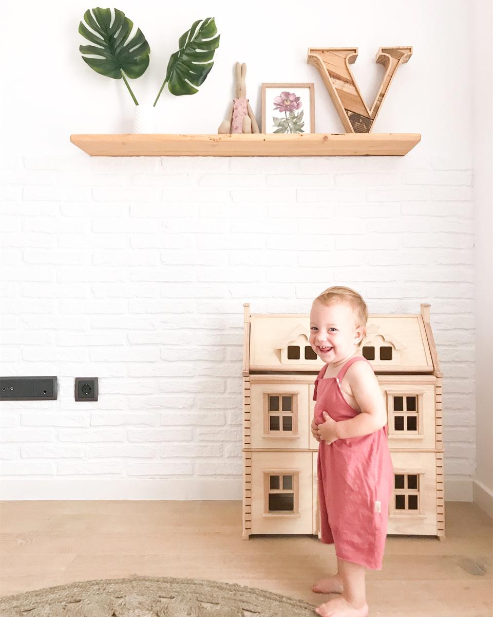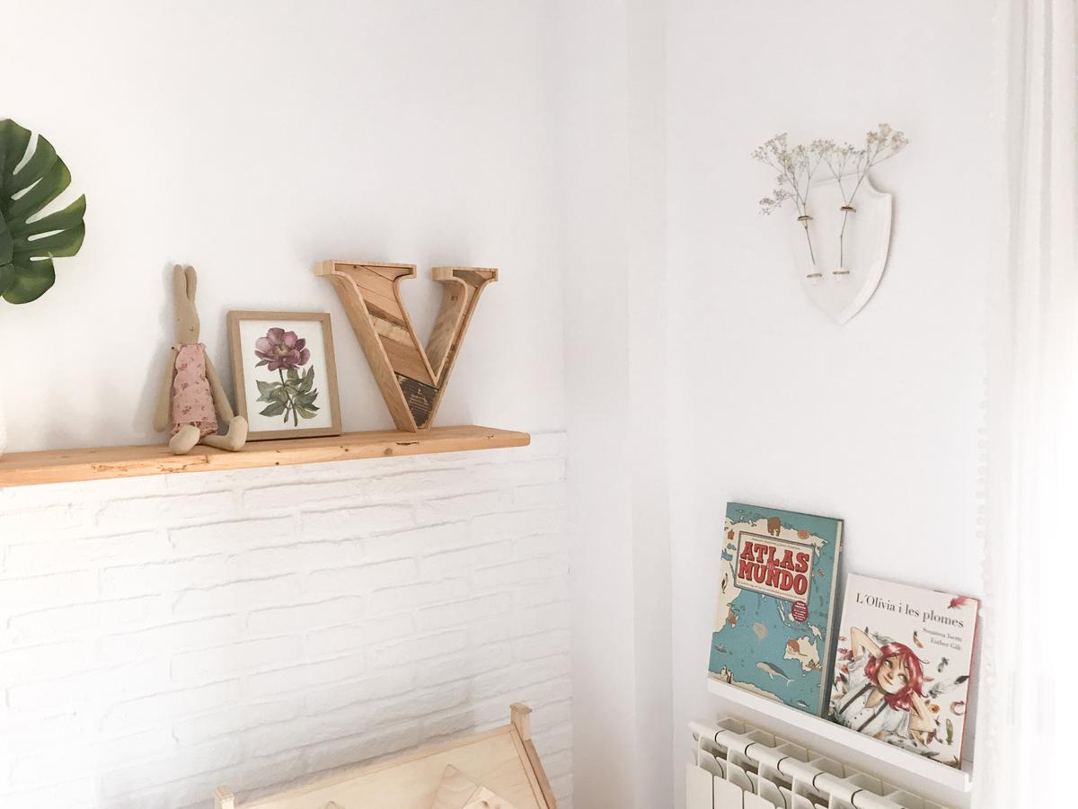 Sobre esta pared de ladrillos, colgamos una estantería que hicimos nosotros mismos. Creo que es de los DIYS que más orgullosa estoy, y pronto os haré un post explicando el paso a paso. Encima de esta estantería, pusimos un tarro de Hema con unas hojas de monstera de plástico, que compramos en Holanda pero que Ikea las ha sacado en el nuevo catálogo y mucho más baratas por cierto! También pusimos una última lámina de flores con un marco de Muy mucho de madera de pino acompañada de un muñequito Maileg de BlauBloom. Reconozco que soy una autentica fan de estos muñecos y que poco a poco se lo voy inculcando a Valentina.