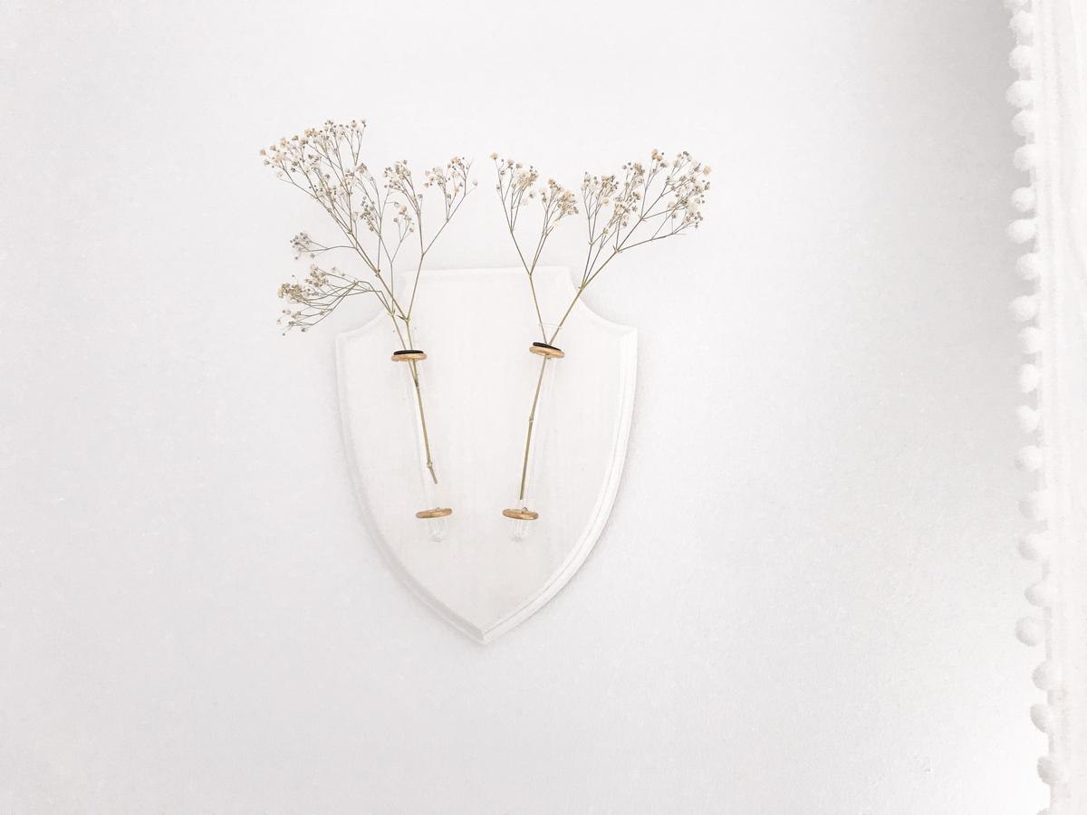 En la otra pared, tenemos un escudo de madera con dos probetas de video en el que se puede poner tanto flor seca como fresca si añadimos un poquito de agua. Me enamoré de ellos nada más verlos en Etsy y me pareció la mejor manera de tener flores en las alturas y que no se convirtieran en víctimas de Valentina… Son de Eco Deer.