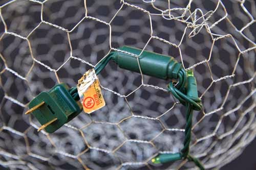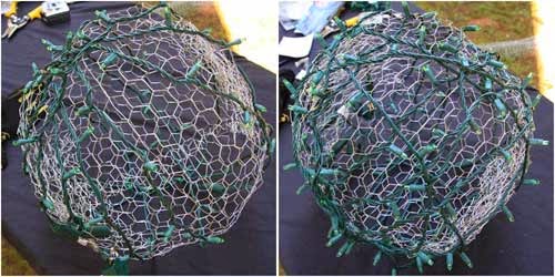 Que tan asombrosas se ven estas bolas de luz! Para hacerlas solo necesitas formar una bolas con alambre de gallinero y cubrirlas con extensiones de luces. Simple, lindo y económico :)
