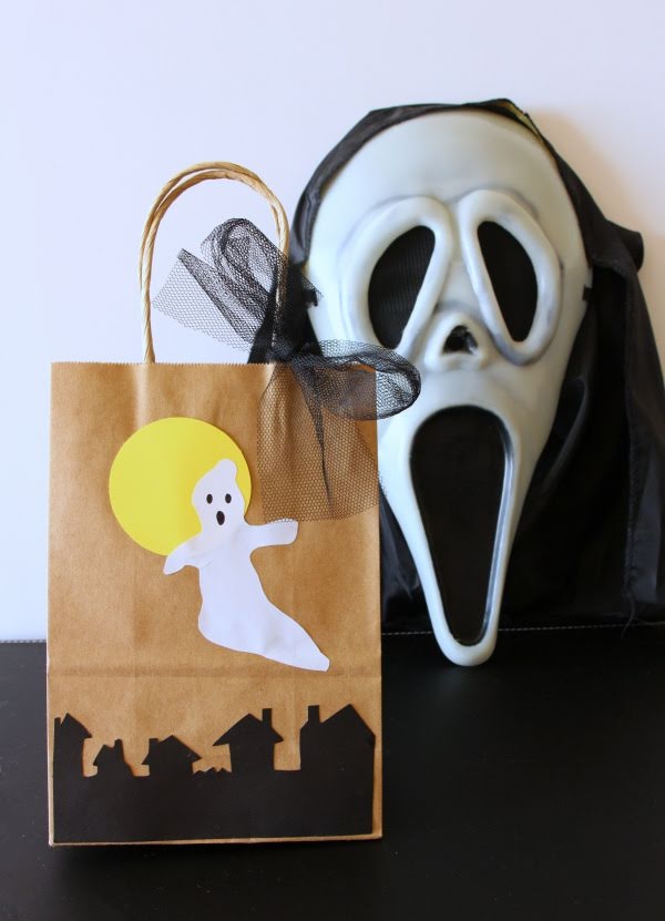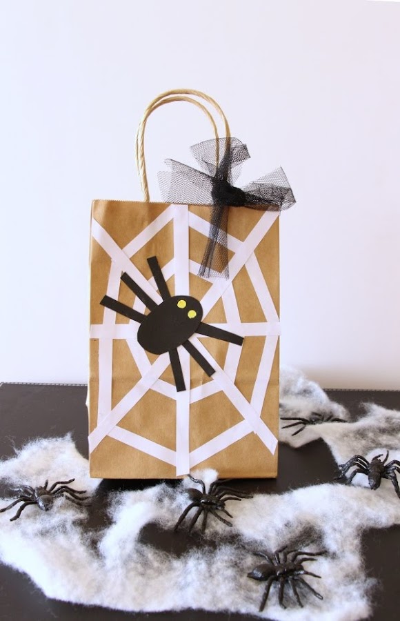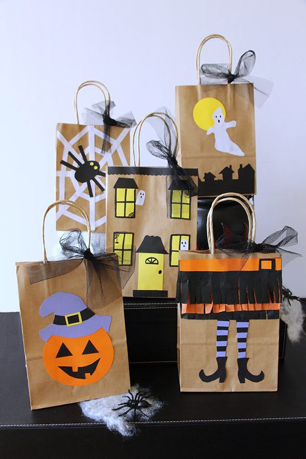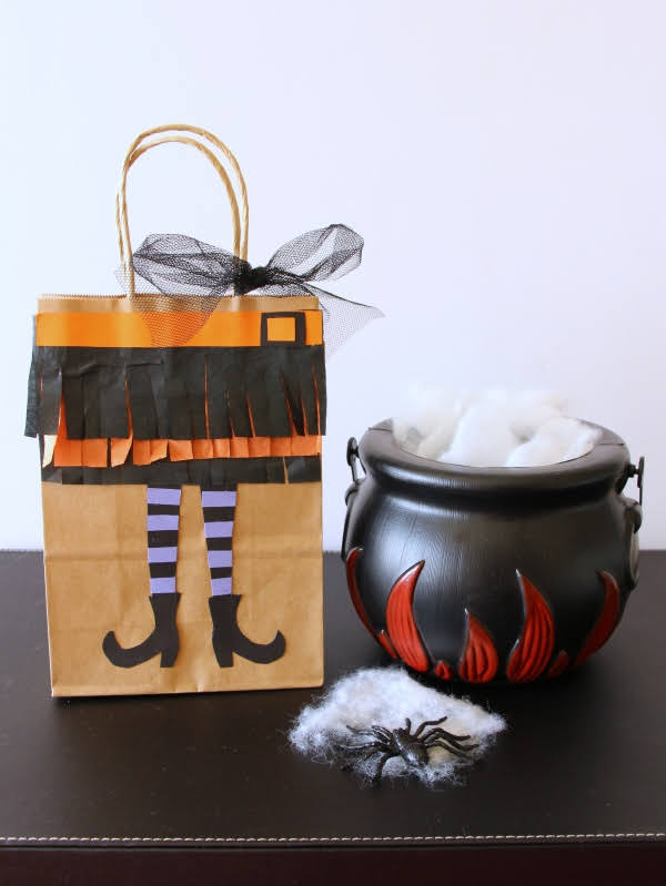 Una de las bolsas que más me gusta es la de las piernas de bruja. Con papel de seda negro y naranja cortada a flecos hacemos la falda y con cartulina las piernas, zapatos y cinturón