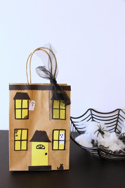 La casa encantada tiene unos detalles hechos con cartulina como los fantasmitas, y otros pintados como las telarañas y el gato.