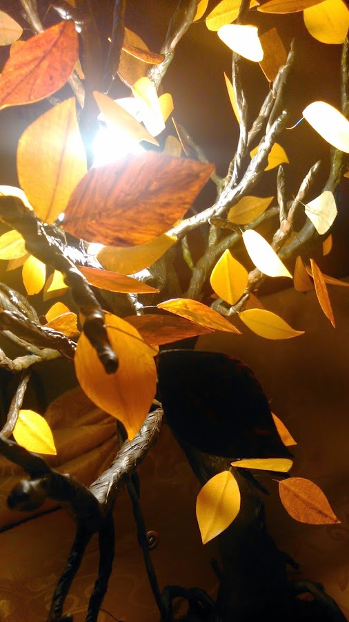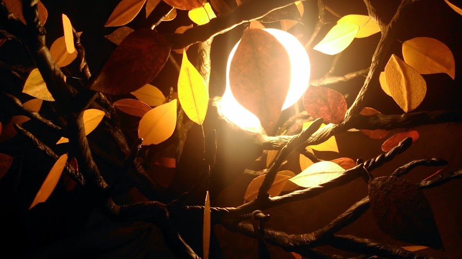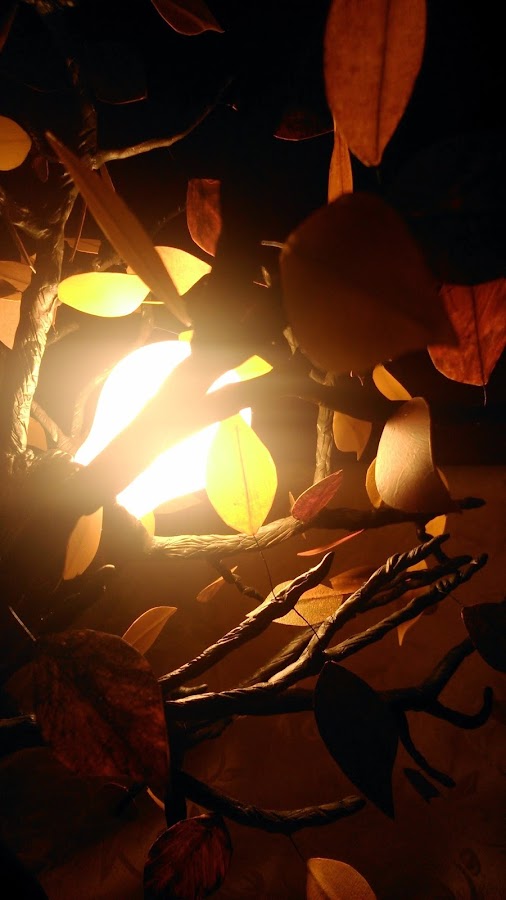 al encender la lampara se ve el juego de luz entre las hojas, generando pequeños reflejos y luminosidad en las hojas.