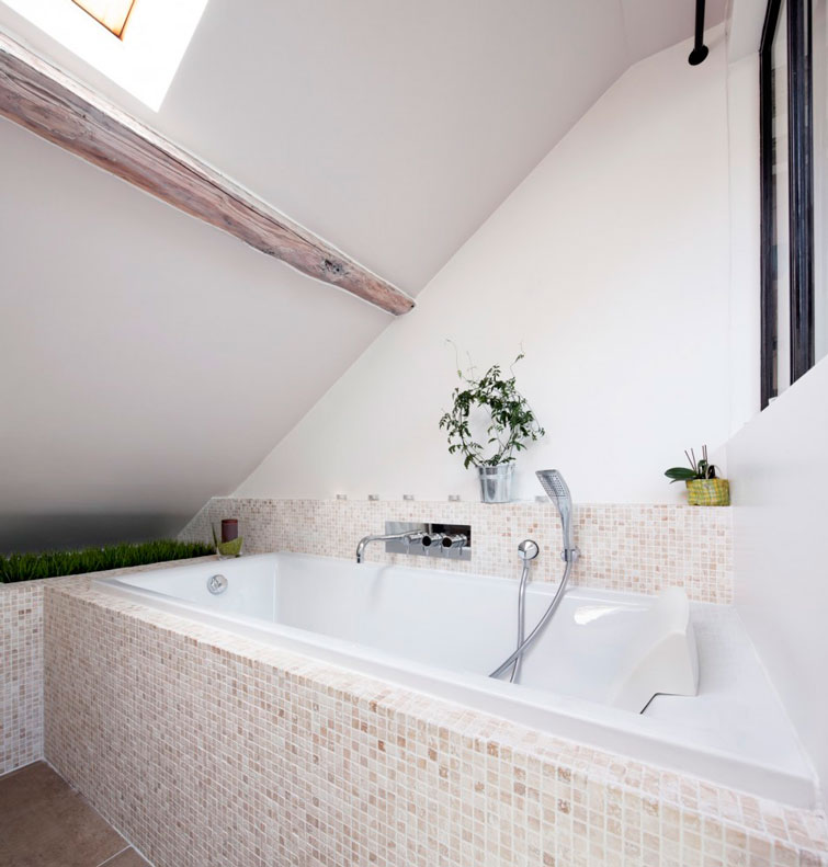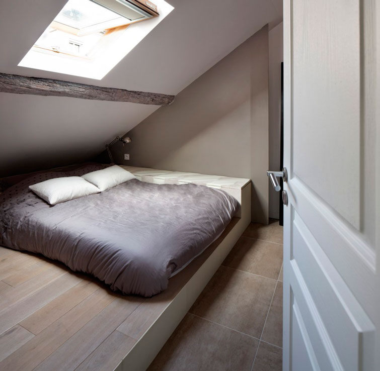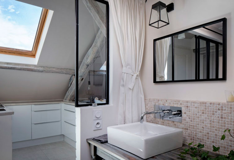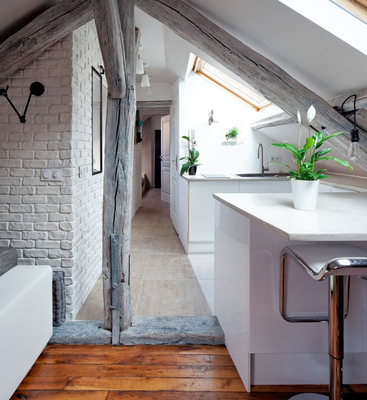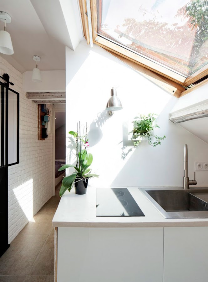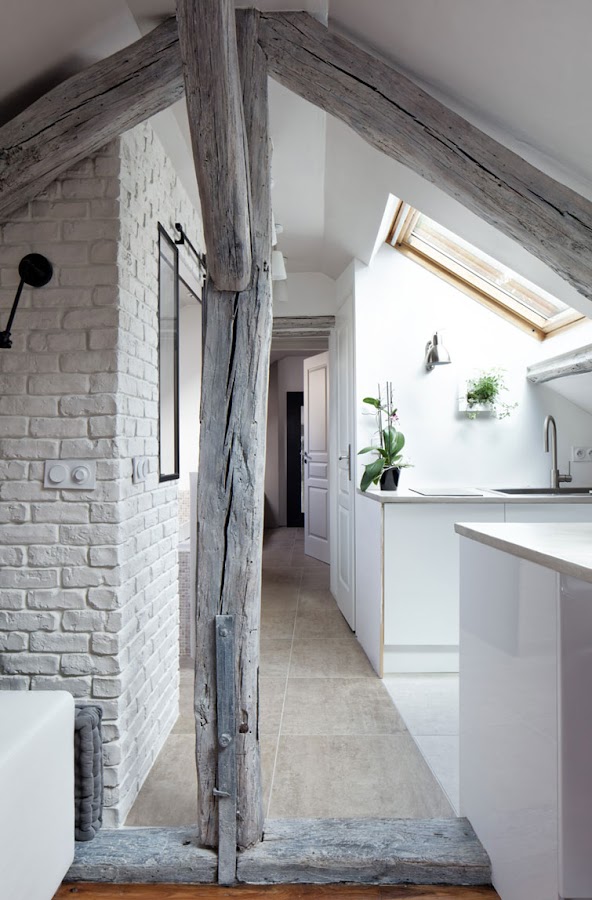 Como os decía, la buhardilla de hoy va muuuucho más allá de la primera vivienda ideal. Quizá sea porque yo viví de pequeña en una buhardilla con techos de este tipo, que las encuentro especialmente bonitas. Solo esas vigas, ya me enamoran. El ladrillo visto, los suelos recuperados, la combinación de muebles tipo Ikea con piezas con solera, el toque verde aquí y allá, la luz natural que entra cenitalmente... Resumiendo: TODO.
