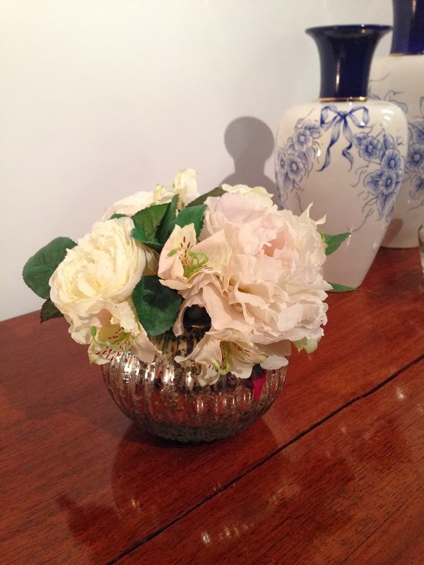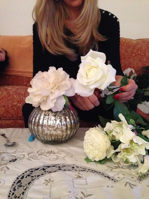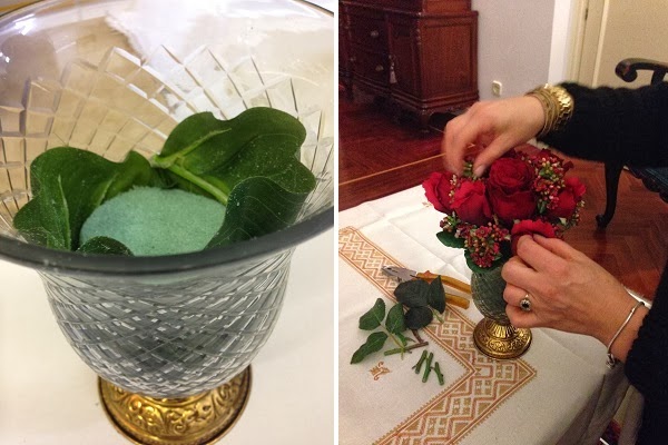 Pensamos en unos centros de flores para las mesitas laterales del sofá, así que lo primero que hicimos fue buscar y comprar los jarrones y después unas flores.