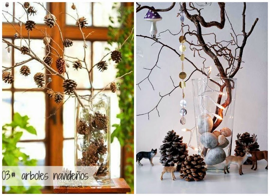 ¿Qué os parece esta opción? Es una de las que más me gusta (aunque me quedo con todas, je, je, je...). Crear un auténtico bosque en nuestro hogar con una bonita rama, de la que podemos colgar las piñas, y para aportar más realismo unos animalillos de juguete.