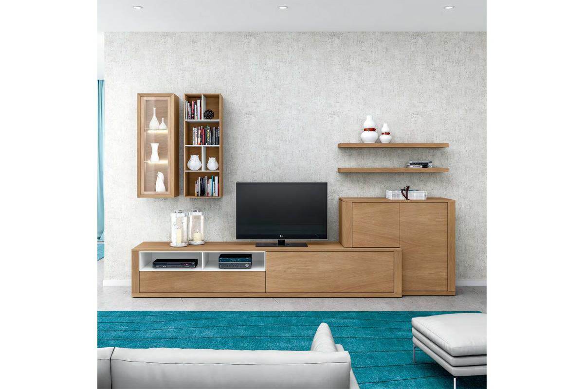 Aunque hemos dicho que las traseras cada vez son más utilizadas, también nos podemos encontrar el caso de que no se utilicen. Aquí nos encontramos una composición en madera de roble formado por un mueble para la televisión que cuenta con puerta abatible, 1 cajón y 2 huecos. También dispone de un módulo apilable en forma de “L” que descansa sobre el mueble de la televisión. Se ha colocado un módulo de colgar con 1 puerta de cristal y otro con 6 huecos. Como en los anteriores casos, los estantes cuentan con los herrajes ocultos.