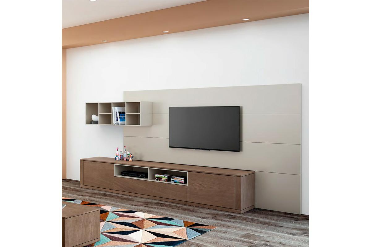Dentro de estas composiciones modulares, nos encontramos módulos para la televisión, distintos huecos y cajones, trasera de televisión con luz o estantes para la pared. Todo ellos con la peculiaridad de contar con herrajes ocultos.