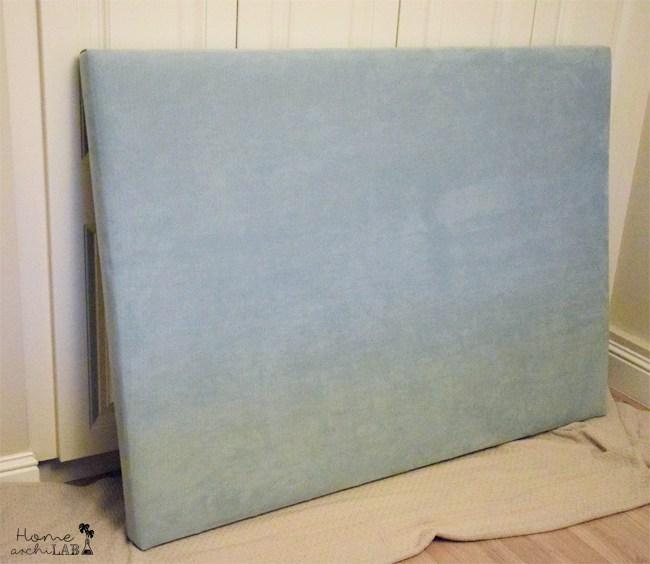 Al ser tan grande la mejor manera que encontré de no ensuciar la tela y manipularlo bien fue poniéndolo boca abajo sobre la cama. Primero la tela con la cara buena hacia abajo y encima el cabecero boca abajo.