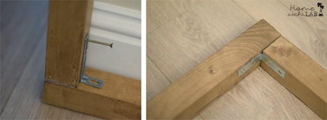 Para unir los tres travesaños del marco usé unas escuadras metálicas atornilladas por el interior para que no se vieran.Además lo pegué con cola.