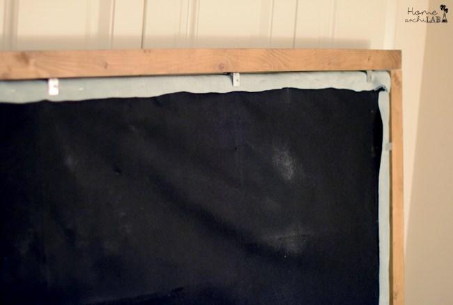 Sobre el tablero pon una plancha de esponja para hacer el acolchado. Esta deberá ser de unos 10 cm de espesor para que tenga suficiente volumen. Y ya podrás tapizarlo de la misma forma que yo lo he hecho, cubiéndolo con la tela y grapándola por la parte de atrás al tablero. Este tablero además será la base para atornillar el marco con las escuadras.