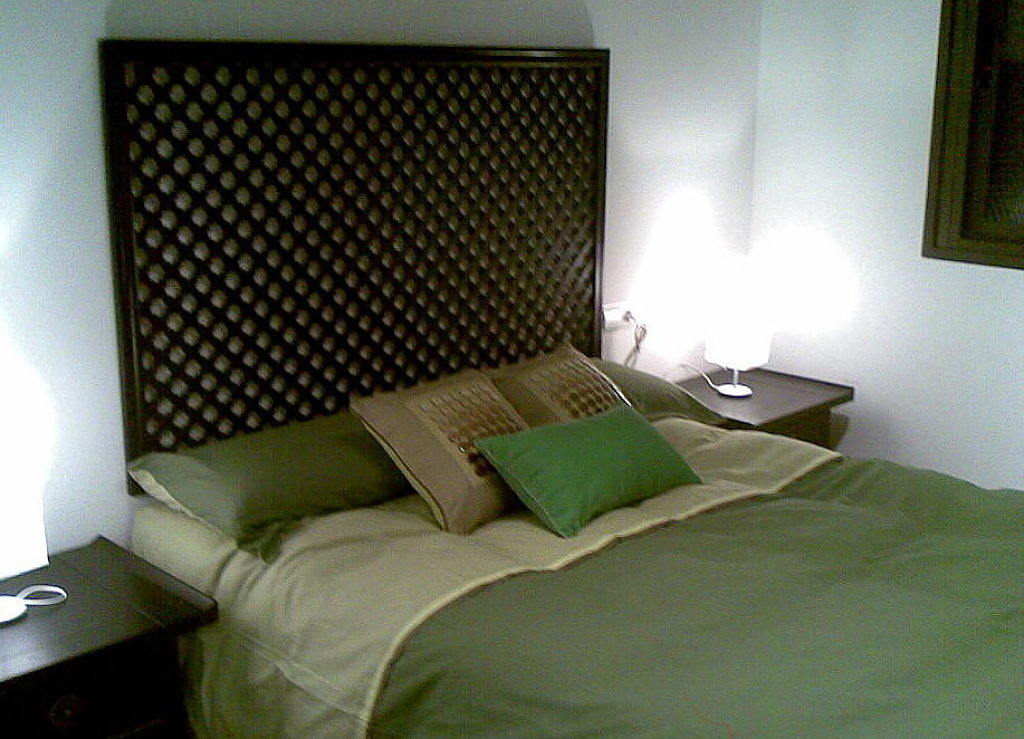 Aquí la idea era mezclar un elemento de jardinería con las colchas en verde, para que fuera algo muy natural. Para ello compré una celosía y la pinté de negro, ya que los muebles eran oscuros. El resultado quedó aparente y muy económico. (es obra mía)