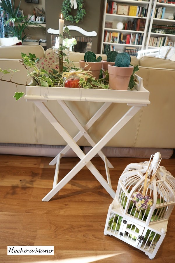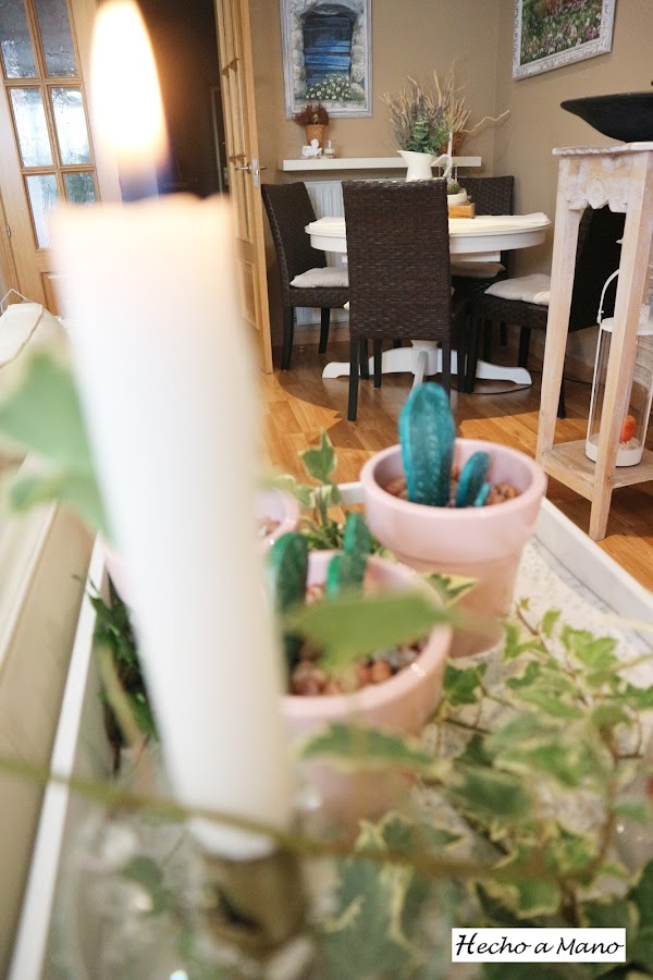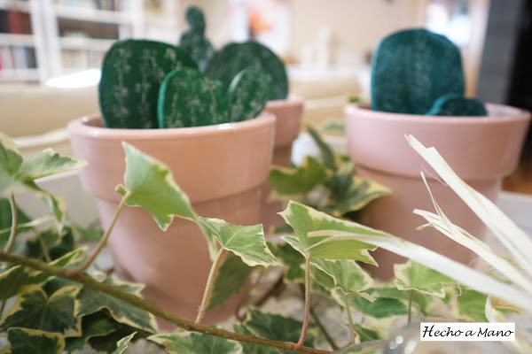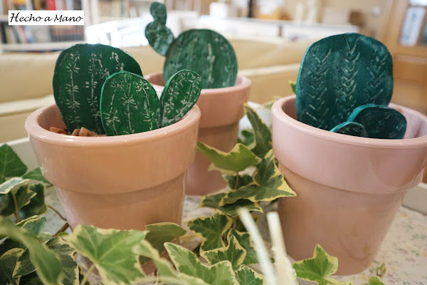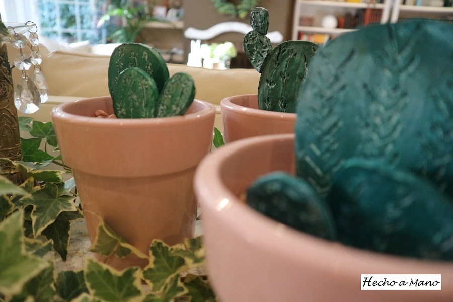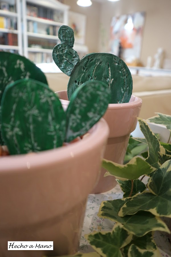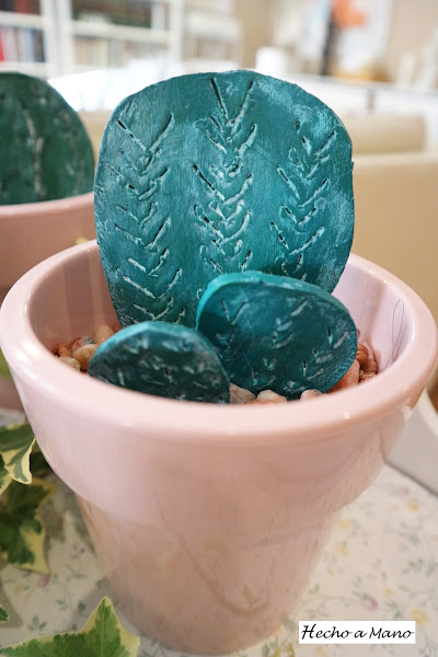 Con un rodillo de cocina aplasté la pasta de modelar. Lo siguiente fue hacer las espinas con un palo de brocheta ( yo, por lo rústico....nada de punzón). A continuación lijé y di un par de capas de pintura y cuando secó pinté las espinas sin tener cuidado de no salirme, porque lo que sobraba lo repartí con un papel de cocina ( más rusticidad) por todo el cactus para aportarle velo blanquecino.