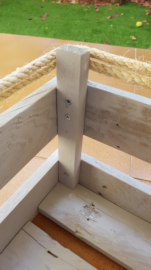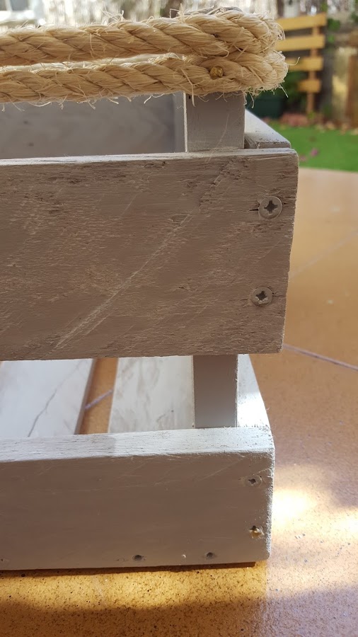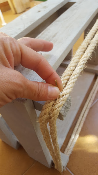 Pintamos del color elegido que en mi caso fue el color gris de la pintura en spray chalky vintage de Leroy Merlín y a modo decorativo, le pongo dos vueltas de cuerda en la parte superior, fijando la cuerda con clavos: