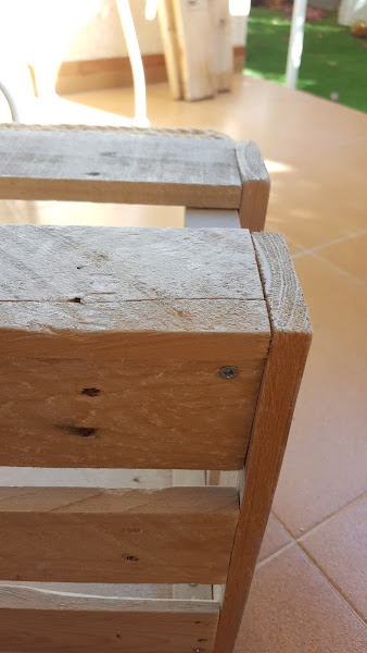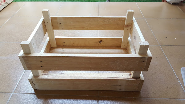 Esa misma mañana del evento, me puse manos a la obra. Tenía que ser algo rápido porque no me daba tiempo de algo más elaborado y me decidí por hacer una caja de frutas, reciclando las tablas de un palet que tenía en el jardín: