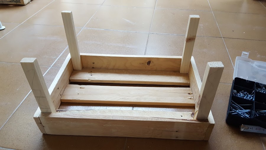 Una vez construida la base, atornillamos los 4 listones más gruesos. Uno en cada esquina y de momento los fijaremos al fondo de la caja con tornillos: