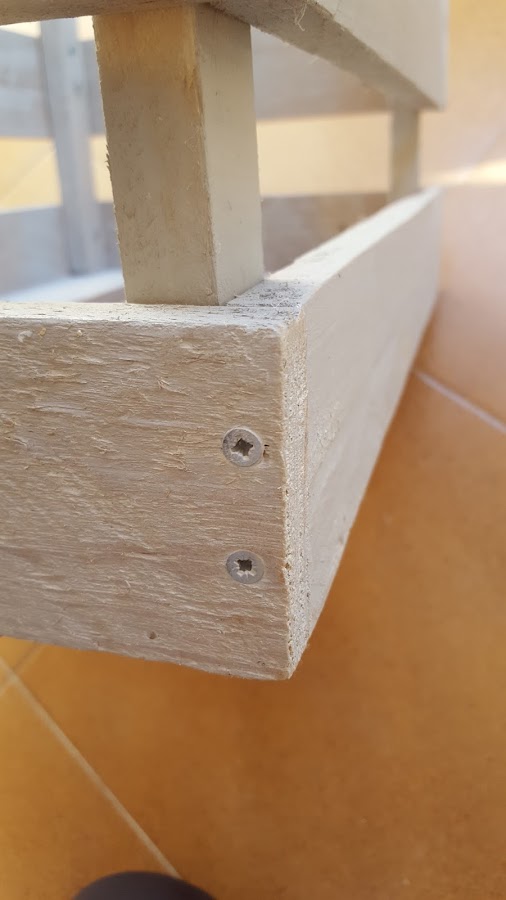 como podéis ver en la imágen, he puesto dos tornillos en la fila de arriba y 1 en la de abajo, pero sólo he atornillado los listones largos de 40cm. Los listones de la parte estrecha los uniré atornillándolos en las esquinas por fuera de la caja igual que hice al construir la base: